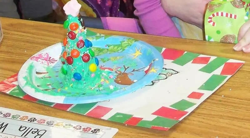 Kids turn an ice cream cone upside down, and make their own edible Candy Christmas Tree Cone with frosting, candy and marshmallows.