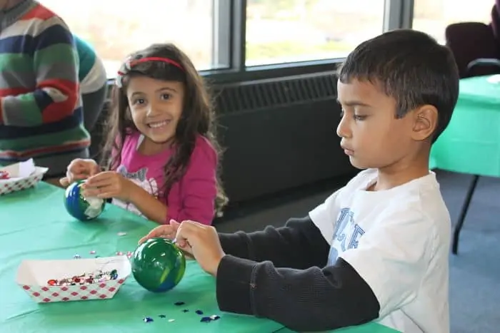 No drying time required! Kids just make and take! Each participant will receive 1 clear plastic ornament with a lid. Kids will choose from a variety of paint colors to squeeze inside of the ornament. Once finished, participants secure the lid and shake until paint has covered the inside of the ornament. They then decorate the outside of their ornament using gems and glitter decals.